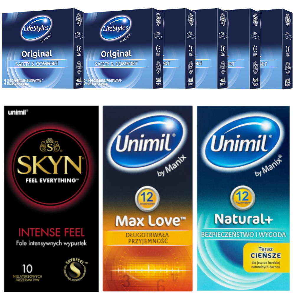 Duży zestaw prezerwatyw zawierający aż 4 różne rodzaje kondomów, w skład którego wchodzi: