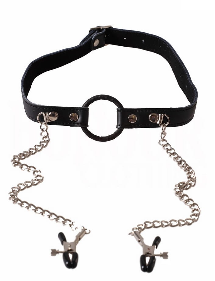 Otwarty perwersyjny knebel BDSM dla osób lubiących dominację lub bycie zdominowanym. Otwarty knebel został wykonany ze stali i owleczony cienkim paseczkiem wysokiej jakości skóry ekologicznej. Uprząż zapinana z tyłu głowy również została wykonana ze skóry ekologicznej, co gwarantuje jej trwałość i piękny wygląd. Do knebla przymocowane są dwa łańcuszki, na których końcu znajdują się dwa zaciski – klipsy na sutki. Posiadają możliwość regulacji siły zacisku, dzieki czemu można dopasować je do własnych preferencji. Ten produkt pozwoli na urozmaicenie życia łóżkowego na dwa sposoby - wprowadzając element BDSM w postaci otwartego knebla oraz pozwalając na symulację sutków poprzez zaciski na sutki.