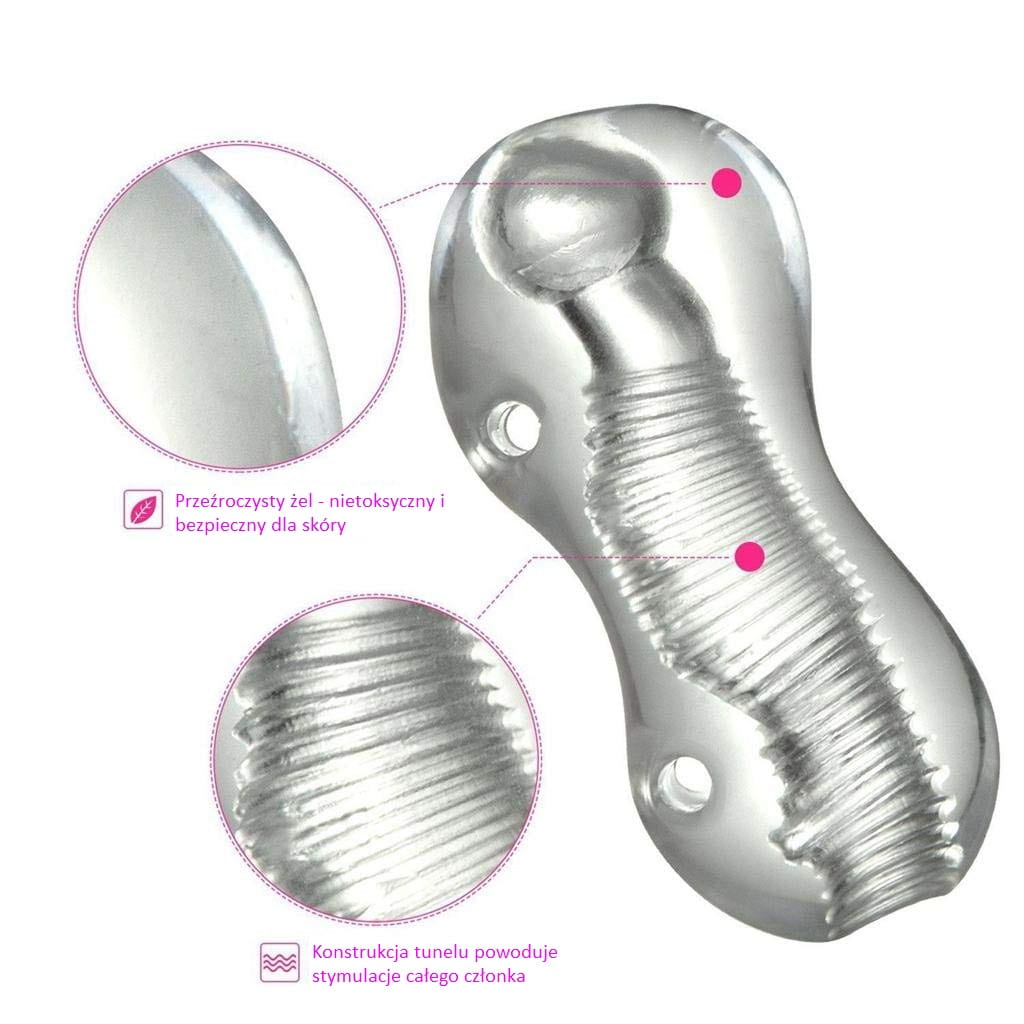 Nowoczesna i futurystyczna sztuczna wagina wykonana z przezroczystego żelu. Mega realistyczny tunel, wypełniony setką wypustek oraz zwężeń i zgrubień zapewni Ci niesamowite doznania. Sztuczna pochwa dobrze leży w ręce – posiada unikalny kształt oraz dwa dodatkowe otwory, które ułatwiają utrzymanie masturbatora w dłoni podczas zabawy. Masturbator posiada tylko jeden otwór, po jednej stronie, dzięki czemu podczas penetracji odczuwalny jest efekt ssący. Zobacz sam jak Twój penis penetruje ten wyjątkowy tunel. Zabawka jest bardzo miękka w dotyku oraz elastyczna, dzięki czemu wielkością dopasuje się do każdego członka.