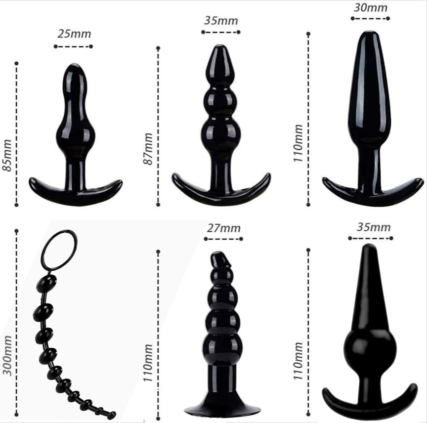 Komplet składa się z pięciu różnych korków do stymulacji analnej oraz jednych koralików analnych. Plugi analne zostały wykonane z najwyższej jakości masy żelowej. To świetny zestaw dla początkujących, którzy chcą spróbować penetracji analnej. Zabawę z korkami analnymi należy zacząć od najmniejszych korków, stopniowo zwiększając ich rozmiar. Opływowy kształt i ergonomiczny uchwyt pozwalają na łatwą aplikację i bezproblemowe wyjęcie zatyczek analnych. Klasyczny czarny kolor sprawia, że zestaw korków jest również bardzo elegancki.