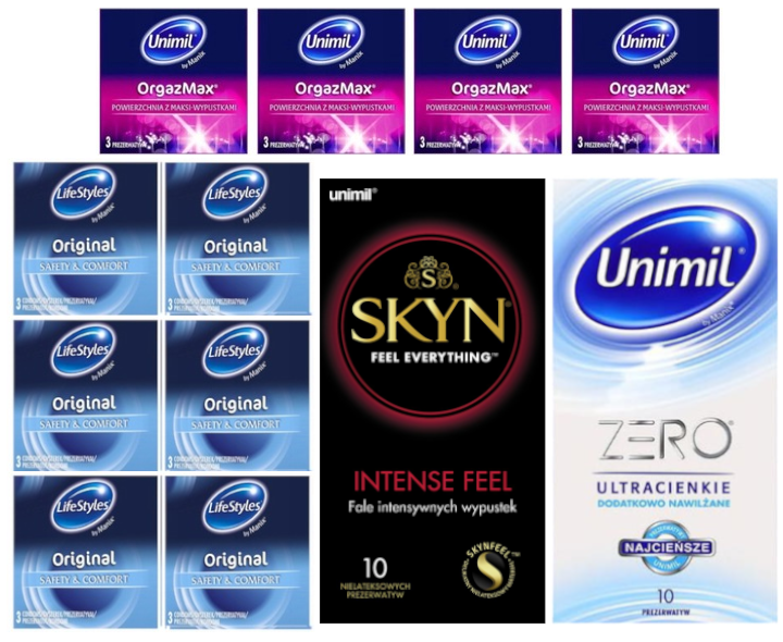Duży zestaw prezerwatyw zawierający aż 4 różne rodzaje kondomów, w skład którego wchodzi: